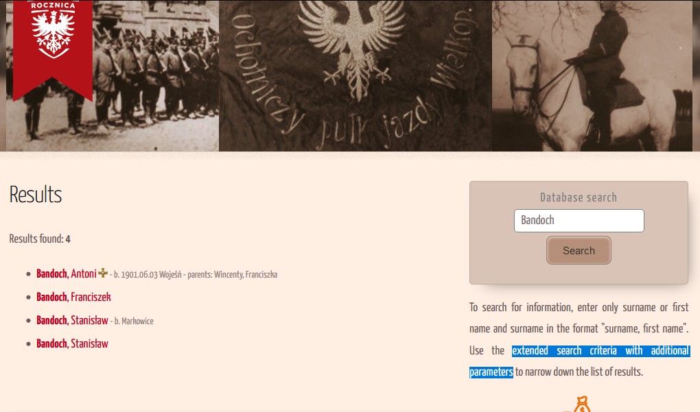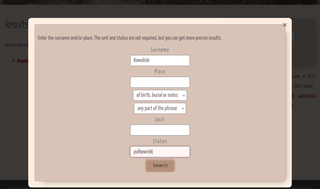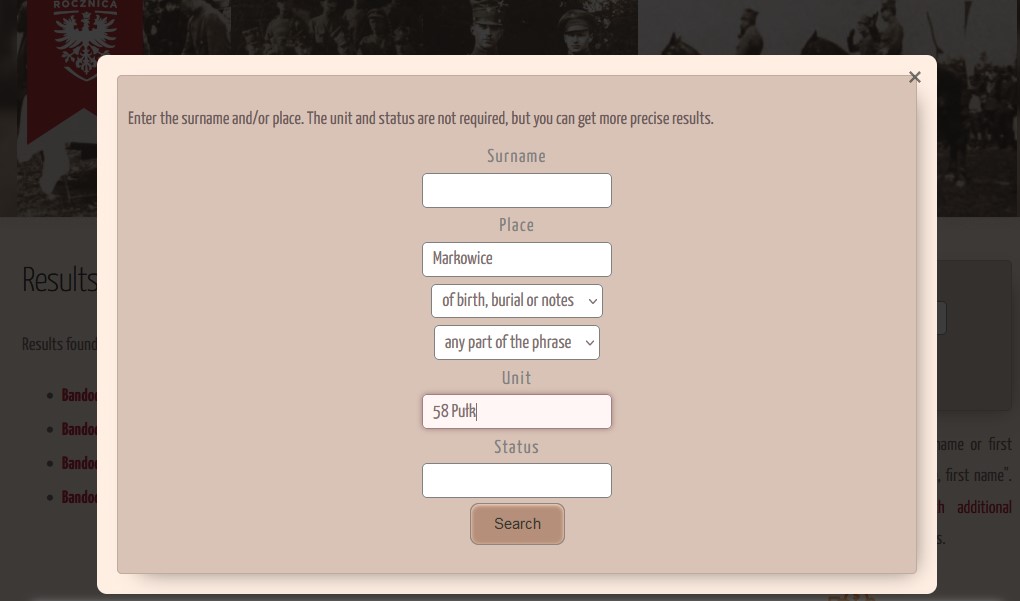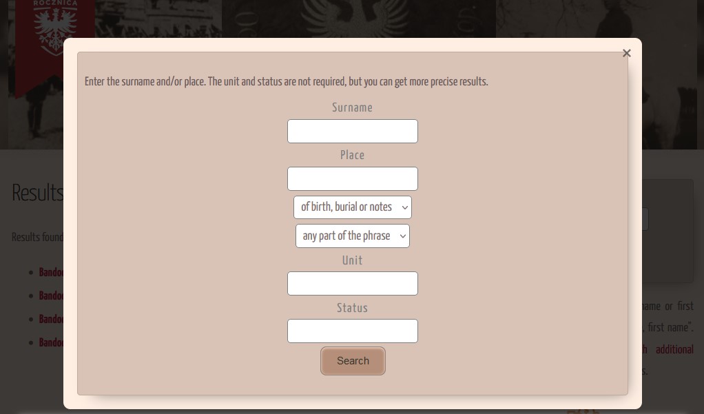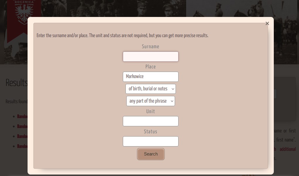 Below the simple search engine is also an entry to a more detailed one, where you can narrow down your criteria. It is possible to search by town and add the status and name of the insurgent unit. However, it should be remembered that these last two conditions only work when one of the first ones is filled in – name or place.