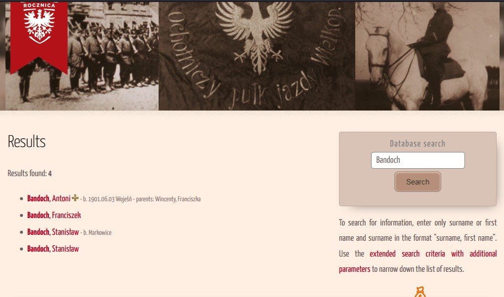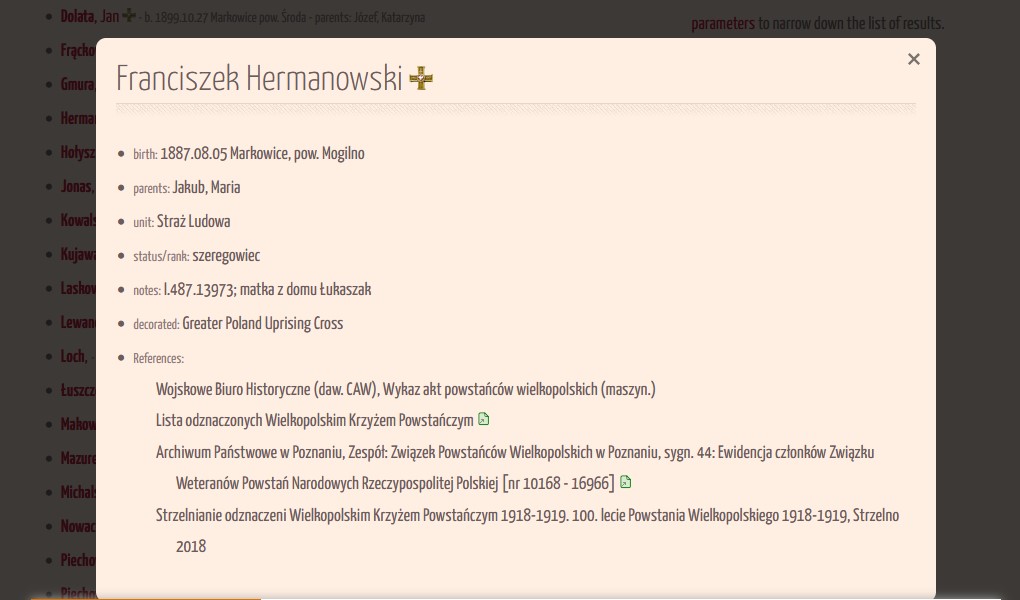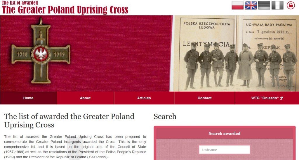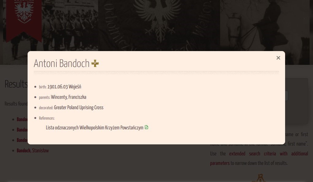 It is in the lower right corner of the home page. However, all people awarded the Cross of the Greater Poland Uprising are redirected to this collection in the main search engine. So it’s basically a repetition of data. In the main search engine, each honored person has a thumbnail of the award next to their surname.